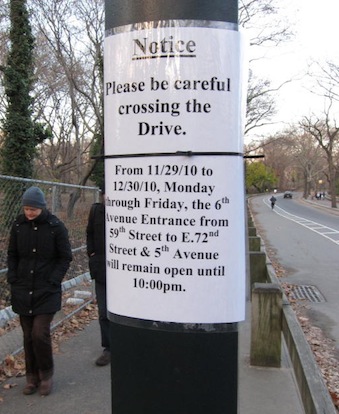 This year, the changes aren't posted where vehicle hours are listed on either the Parks Department or Central Park websites, and the reduction in car-free time isn't included in DOT's annual holiday traffic plan [PDF]. The DOT press office referred our initial request to NYPD. We're awaiting a response from the police.