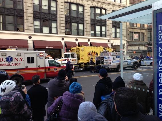 A woman was fatally struck by a private sanitation truck in the Flatiron district in Manhattan today. According to police, the incident happened around 12:26 p.m. at East 23rd Street and Madison Avenue. An NYPD spokesperson confirmed the woman was pronounced dead at the scene, but had little other information. Based on photos, it appears she was hit by a CityWide demolition and rubbish removal vehicle.