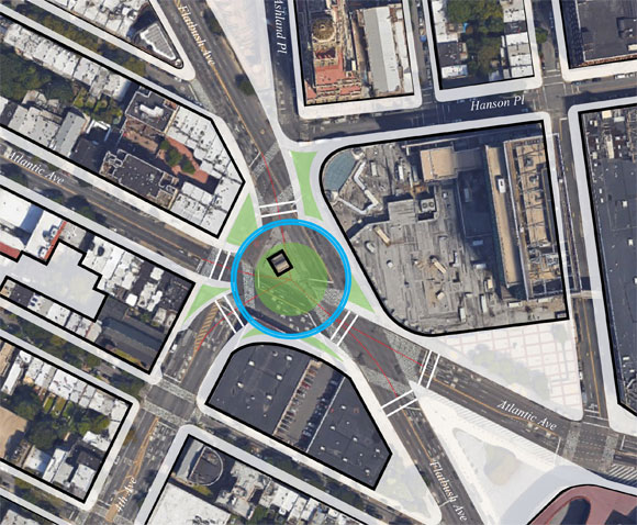 For a very rough idea of how the Flatbush/Atlantic/Fourth site compares to two other large traffic circles in NYC, take a look at these Google satellite views at the same scale.