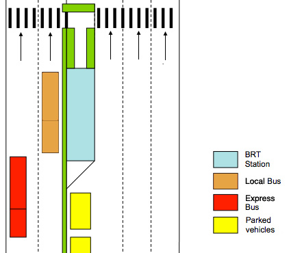 The biggest shortcoming of NYC bus lanes, however, is that they are so easy to park in. A physical barrier would keep other vehicles from intruding. On First and Second avenues, this would entail setting aside two lanes for a busway (one for locals, one for expresses) as well as median space for waiting areas: