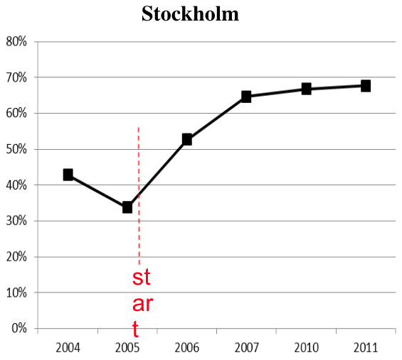 When Stockholm began charging drivers to access the city center, car trips across the cordon dropped 20 percent. Travel times improved immediately, and emissions fell. Contrary to doomsday predictions from Stockholm media and political opponents of congestion pricing, the policy was an overnight success.