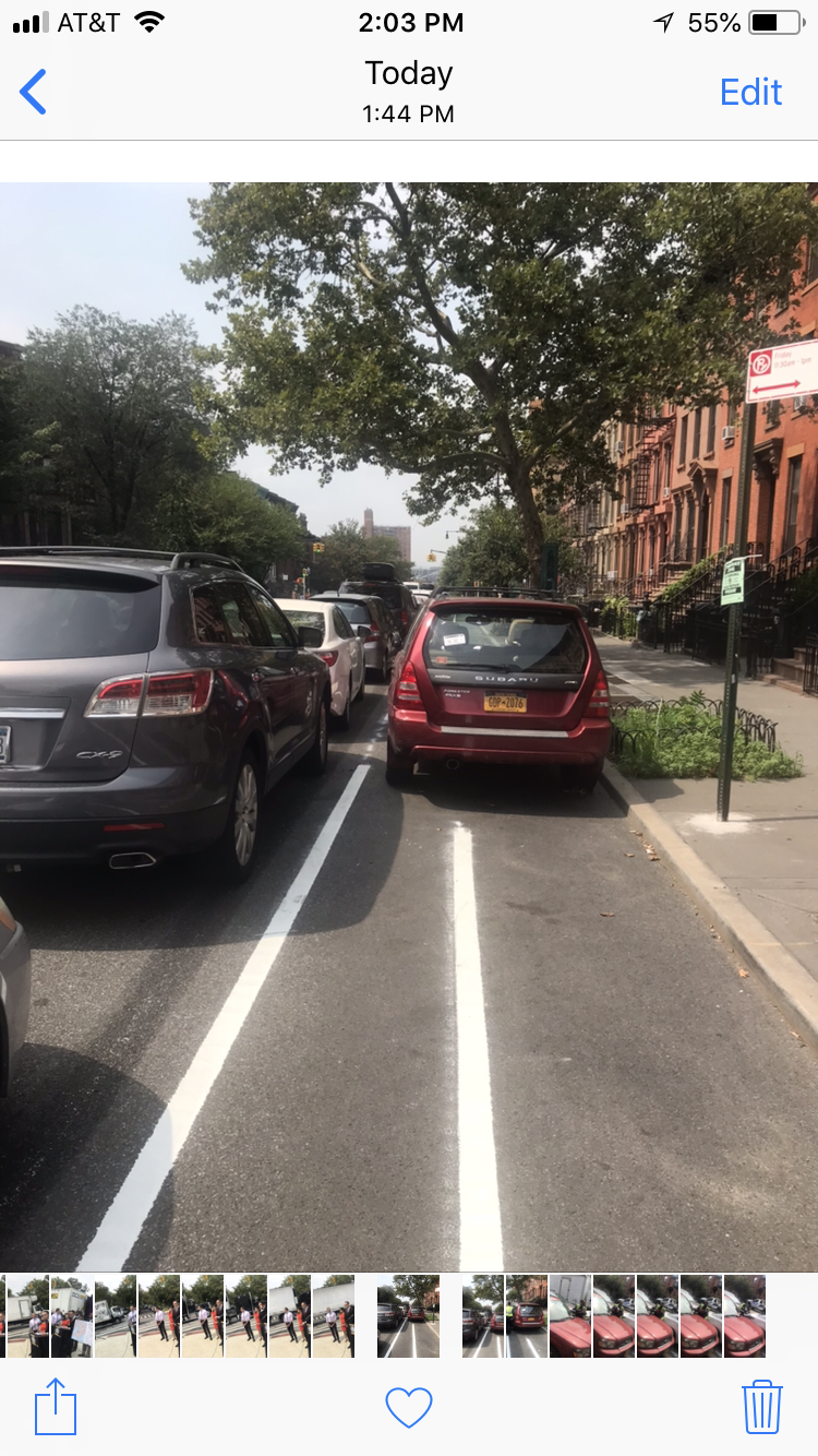 Park Slope cyclists were flying over their handlebars (metaphorically) this weekend when they spotted this vehicle blocking the just-installed bike path between Seventh and Eighth avenues.