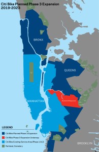 The map of the expansion zone (left) follows a promise that Citi Bike officials made last year to double the bike share system’s footprint, and triple its fleet size to 40,000 bikes, by 2023, so Tuesday’s announcement appears to be on schedule.