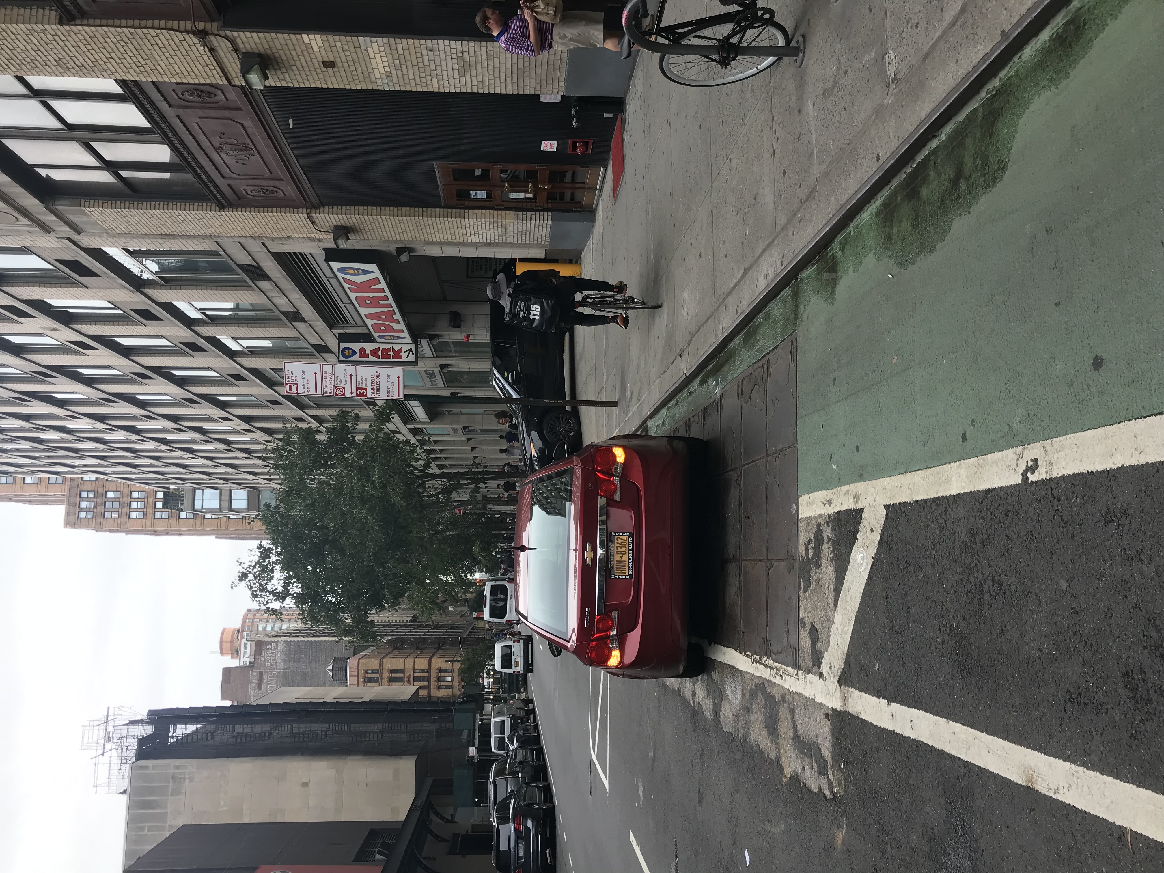 Of course, that’s what happens when the city installs a bike lane on a block with multiple active loading zones. The commercial nature of the block also encourages workers to just dart out into the street to access their trucks.