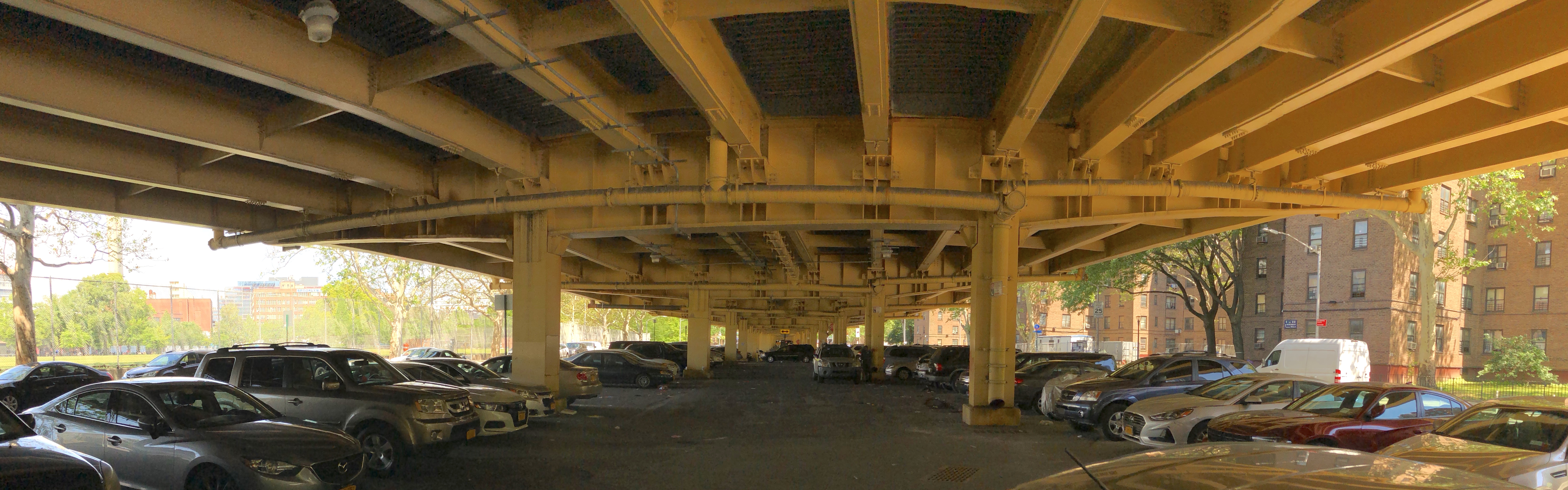Park Avenue (or should we refer to it as Car Park Avenue?) below the BQE viaduct. This section of the BQE infamously separates the Ingersoll Houses from Commodore Barry Park and its swimming pool. Photo: Michael King