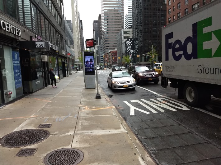 For pedestrians, the small-ish amount of sidewalk space, which didn’t seem like an issue before the advent of social distancing, now presents a massive headache. Narrow sidewalks are a problem on most major avenues in heavily commercial East Midtown, most clearly on Lexington Avenue’s almost tight-rope thin walkways, but at least on Lexington and Second avenues there’s a parking lane and a bus lane you can occasionally dodge into.