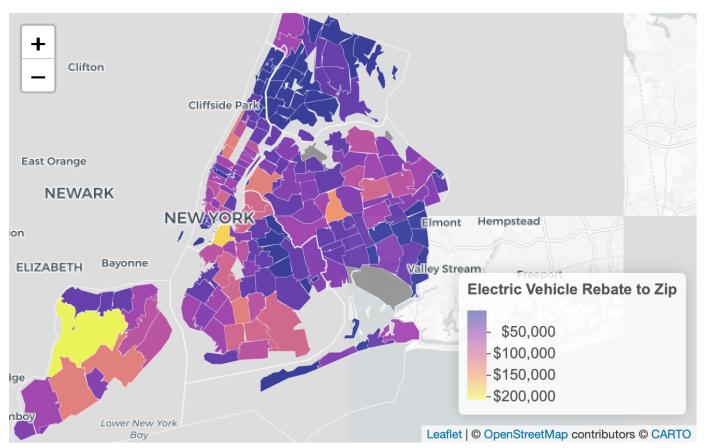 And in some of the richest New York City ZIP codes, scores of people got the rebates, while in at least one of the poorest neighborhoods, just a single resident took advantage of the subsidy, which ranges from $500 to $2,000, depending on how many miles the vehicle can go entirely on electric power and the cost of the car itself (vehicles above $60,000, such as the Tesla Model S, qualify for the minimum $500 rebate, even though its “all-electric” range is among the highest, but the $40,000 Tesla Model Y qualifies for the full $2,000 rebate).