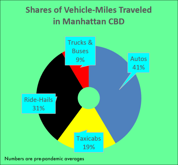Before the pandemic, for-hires accounted for half of all miles driven in the Manhattan Central Business District. Nearly 20 percent of the total was taxis, a little over 30 percent was ride-hail Ubers and Lyfts.