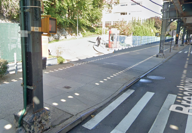 The next signalized crossing is at 220th Street, the entrance to the Allen Pavilion — and, in fact, it is a dangerous “signalized sidewalk” (see above), a non-ADA-compliant arrangement that has led to at least one traffic death elsewhere in the city.