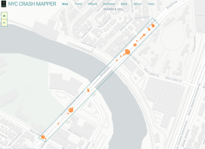 The Broadway Bridge corridor — counted as the 10 blocks from West 218th to West 228th streets — is clearly a dangerous place. In the last five years (from December 2016 until this month) there have been nearly 300 crashes, injuring 11 cyclists, 31 pedestrians and 78 motorists, according to Crashmapper. That’s more than one crash every week.