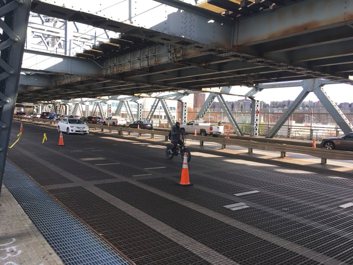 That could change because of the bridge rehabilitation, which the DOT says should finish in 2027. (Yes, it will take almost six years to fix this one little bridge.) As part of the rehab, the department will convert one northbound vehicle lane to a bike lane with a “special surface” on the bridge deck — a bike lane it promised in “Connecting Communities,” a 2018 presentation about creating bike facilities on the 10 Harlem River Crossings, including the Broadway, Washington, and Macomb’s Dam bridges. Moreover, the DOT says that it will be presenting a plan for on-street connections in the Bronx to the community next year.