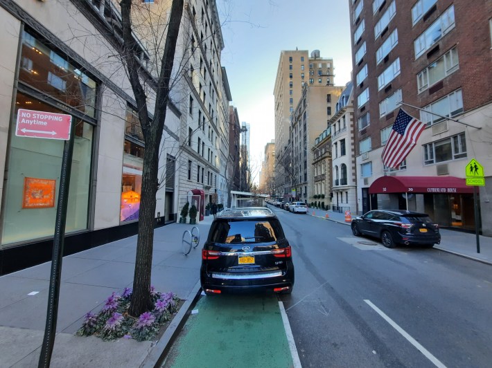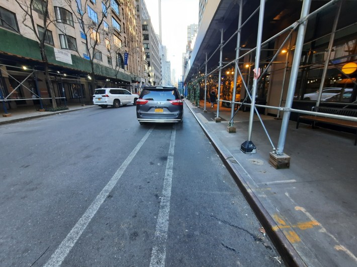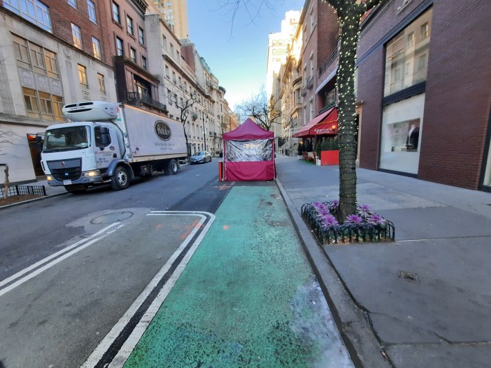 As I noted in Streetsblog last August, on both the 61st and 62nd street lanes, further west between Park and Madison avenues, obstructions, notably restaurants’ outdoor structures placed directly in the painted lane in several locations on 62nd Street, make the lanes unusable. On 61st Street between Park and Madison, the DOT has not painted or marked the lane at all, months after designating it as such.