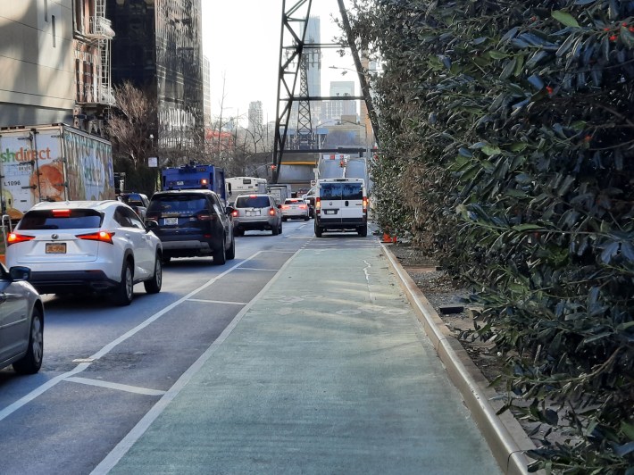 A month after our then-incoming transportation commissioner vowed to fix the flawed design of the unprotected bike lane where a truck driver mowed down a delivery cyclist and a pedestrian, the city has done nothing to stop motorists from mobbing the bike facility.
