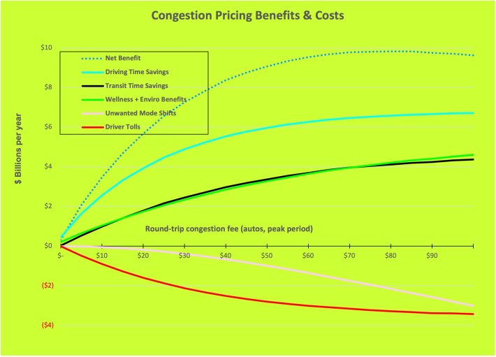 As we can see in the second chart, the congestion fee that maximizes the net benefit is $80, which is nearly six times greater than the likely congestion fee of $13-$15. At the optimal toll level of $80, the net societal benefit is nearly $10 billion per year.