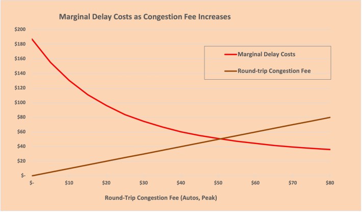 This situation is often called the tragedy of commons. Traffic congestion is a negative externality where the common public resource — the road — gets overutilized by its free availability and then doesn’t work for the common good anymore. (Besides traffic congestion, another crisis that falls under the tragedy of commons framework is climate change, since polluters are rarely charged for dumping CO2 into the atmosphere.) The marginal cost in our context simply means collective delay costs borne by all drivers due to an additional vehicle round-trip to the Manhattan Central Business District, the cordoned area.