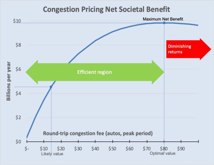 - The likely congestion fee between $13 and $15 is an efficient range that reaps approximately half the maximum net benefit while charging less than a fifth of the optimal congestion fee.