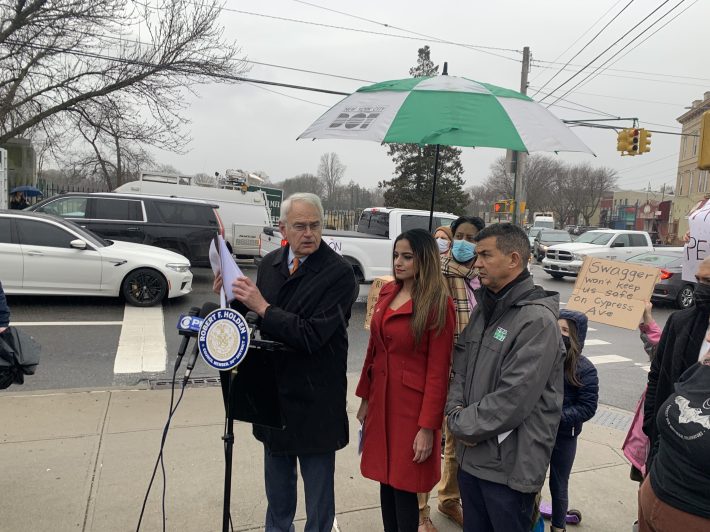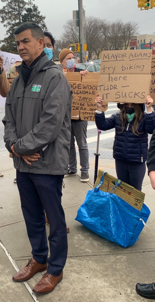 “Commissioner, we need help,” Council Member Bob Holden told Rodriguez at a rally at the corner, where children held signs reading, “Swagger won’t keep us safe on Cypress Avenue” and “Mayor Adams, try biking here; TL, DR, it sucks.”