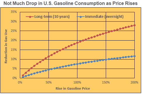 - a short-term price-elasticity of minus 0.11, meaning that a 50-percent hike in the price of gas brings about only a 4- or 5-percent immediate drop in use (see blue curve in the graph above).
