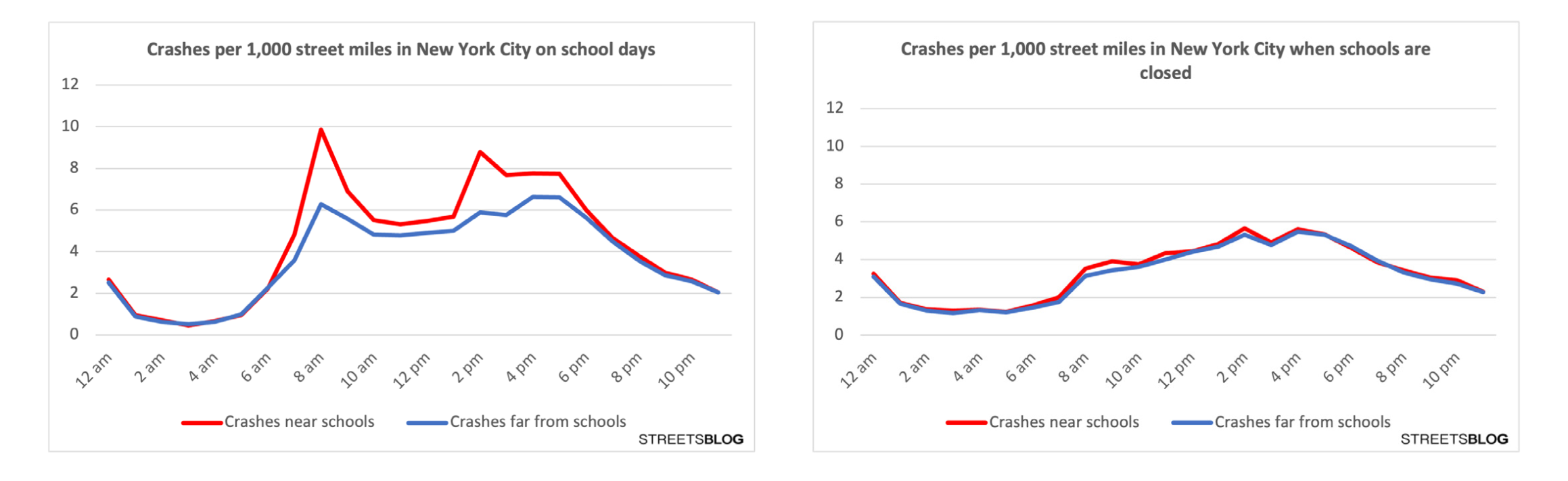 - On school days, streets near schools are more dangerous on average than other city streets. During the 8 a.m. hour, when hundreds of thousands of children stream into 1,600 city-run public schools, there are 57 percent more crashes and 25 percent more injuries per mile on streets near schools than on the city’s other streets. This disparity largely disappears on days when schools are closed.