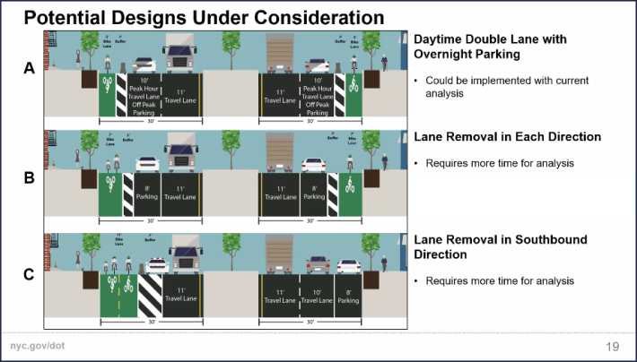 - Option A would follow a pattern of Second Avenue in Manhattan, where parking is allowed only during non-rush hours to accommodate high vehicle volume. It would add a protected bike lane, but would not reduce the four lanes of traffic, as the local officials want. The parking lane would return at night to narrow the roadway when speeding is most common.