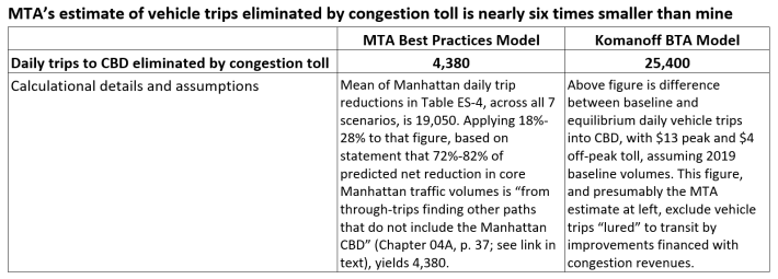 My modeling finds that, not counting diversions, congestion tolls high enough to meet the legislated target of $1 billion a year in new net revenue will cause around 25,000 current daily vehicle trips to the CBD to disappear. As best I can determine, the MTA’s environmental assessment finds only around 4,400 eliminated trips, a figure nearly six times less than my estimate.