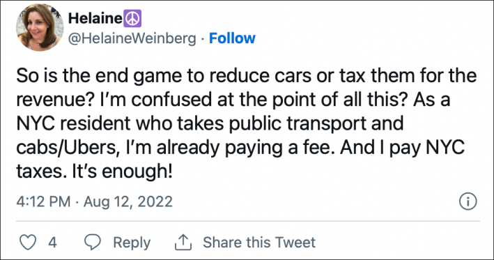 If Gelinas had me in mind, I want to assure her that my career has been long and varied. Nevertheless, it’s true that hundreds of us have poured hearts and souls into what we hoped would be a reasonably straightforward effort to have New York drivers finally pay a toll to offset and reduce some of the congestion costs they create.