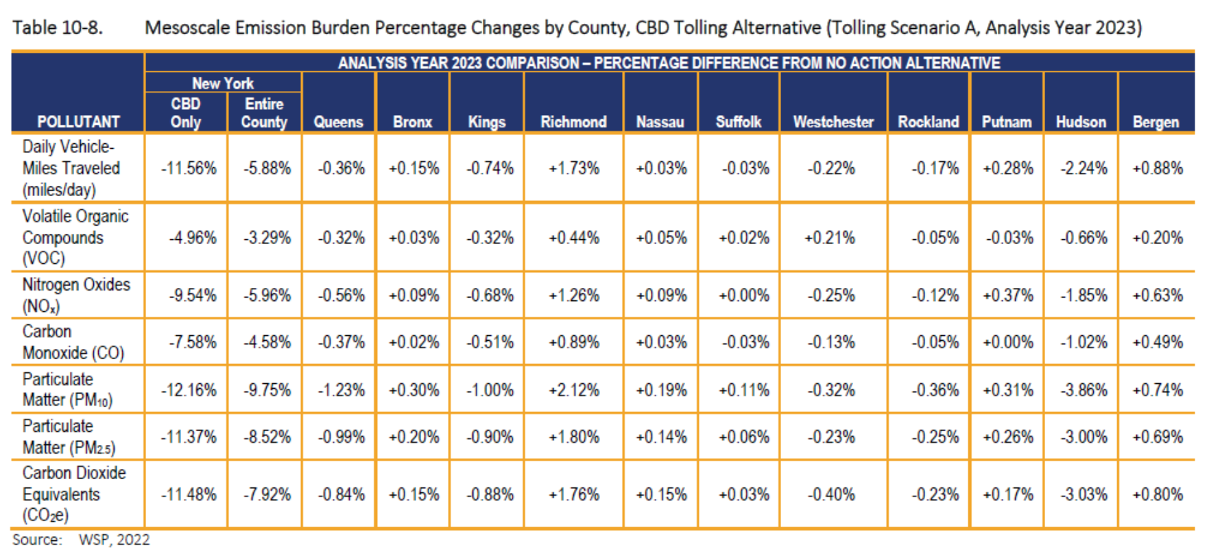 The MTA’s environmental assessment projects incremental changes in each county’s vehicular emissions, including emissions of fine particulate matter (PM2.5), the pollutant most injurious to human health — though only for Toll Scenario “A.” The changes are presented in the MTA assessment’s Table 10-8, which we have reproduced here: