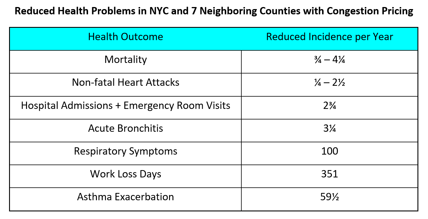 Increases in VMT ordinarily bring higher tailpipe emissions and worsened air quality. But ambient air concentrations of fine particulate matter (PM2.5), the cause of most pollution-related health impacts from vehicular traffic, arise not only from tailpipes (and brake and tire wear) but also from atmospheric conversion of emissions of nitrogen oxides and volatile organic compounds. The “decoupling” in our results of Bronx pollution concentrations, which would fall slightly, from slightly rising Bronx vehicle travel in the scenario studied, comes about because reduced vehicle travel and emissions in Manhattan, Queens, Brooklyn, Westchester County and Rockland County lead to diminished particulate formation over the Bronx and lower atmospheric transport of PM2.5 into the Bronx. The net result is that less particulate matter will be present in Bronx air with congestion pricing, and per-capita health benefits will, accordingly, be roughly the same as for Queens, Brooklyn, and Hudson County.