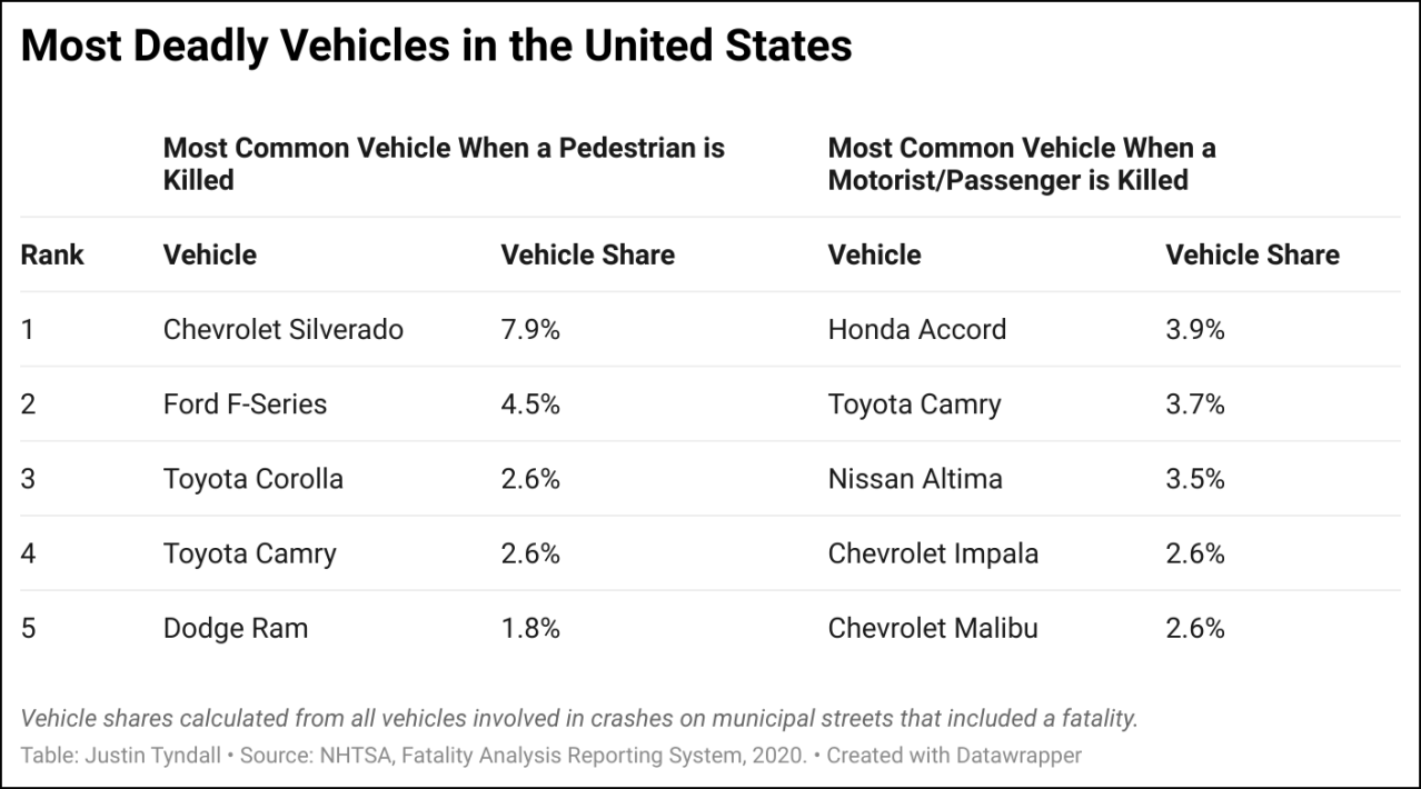 The link between imposing sizes and increased danger is indisputable: the metropolitan areas in the U.S. that experienced the greatest shift towards larger vehicles have also experienced the greatest increase in pedestrian deaths. If policies existed to discourage large vehicles 20 years ago, and each light truck was replaced by a car, the U.S. would have prevented over 8,000 pedestrian deaths. The largest SUVs and pickups are the most dangerous for pedestrians: they are more likely to hit pedestrians and more likely to be fatal to those they hit. Surprisingly few vehicle models are responsible for a large share of deaths. In 2020, if a pedestrian was killed in a collision on a city street, there was a 12 percent chance that a Chevy Silverado or Ford F-Series truck was involved. When looking at crashes that involved the death of a driver or passenger, the figure was only four percent.