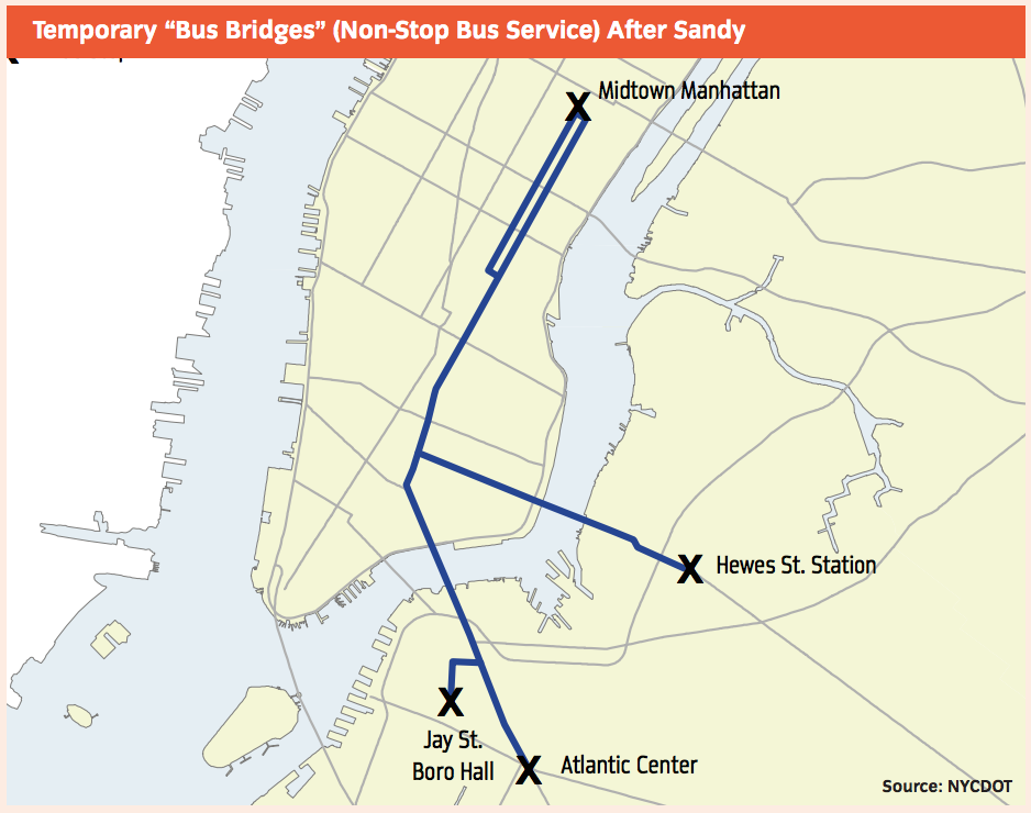 One of the successes of the post-Sandy streetscape was the MTA and DOT partnership on "bus bridges," the agencies' replacement for subway service between Brooklyn and Manhattan. As the NYU Wagner report notes, the MTA was able to get 3,700 people per hour between Brooklyn and Manhattan on buses thanks in part to exclusive bus lanes on the Manhattan Bridge partnered with bus exclusivity from Atlantic Center as well as high occupancy vehicle lanes on the Williamsburg Bridge, all of which were enforced by the NYPD.