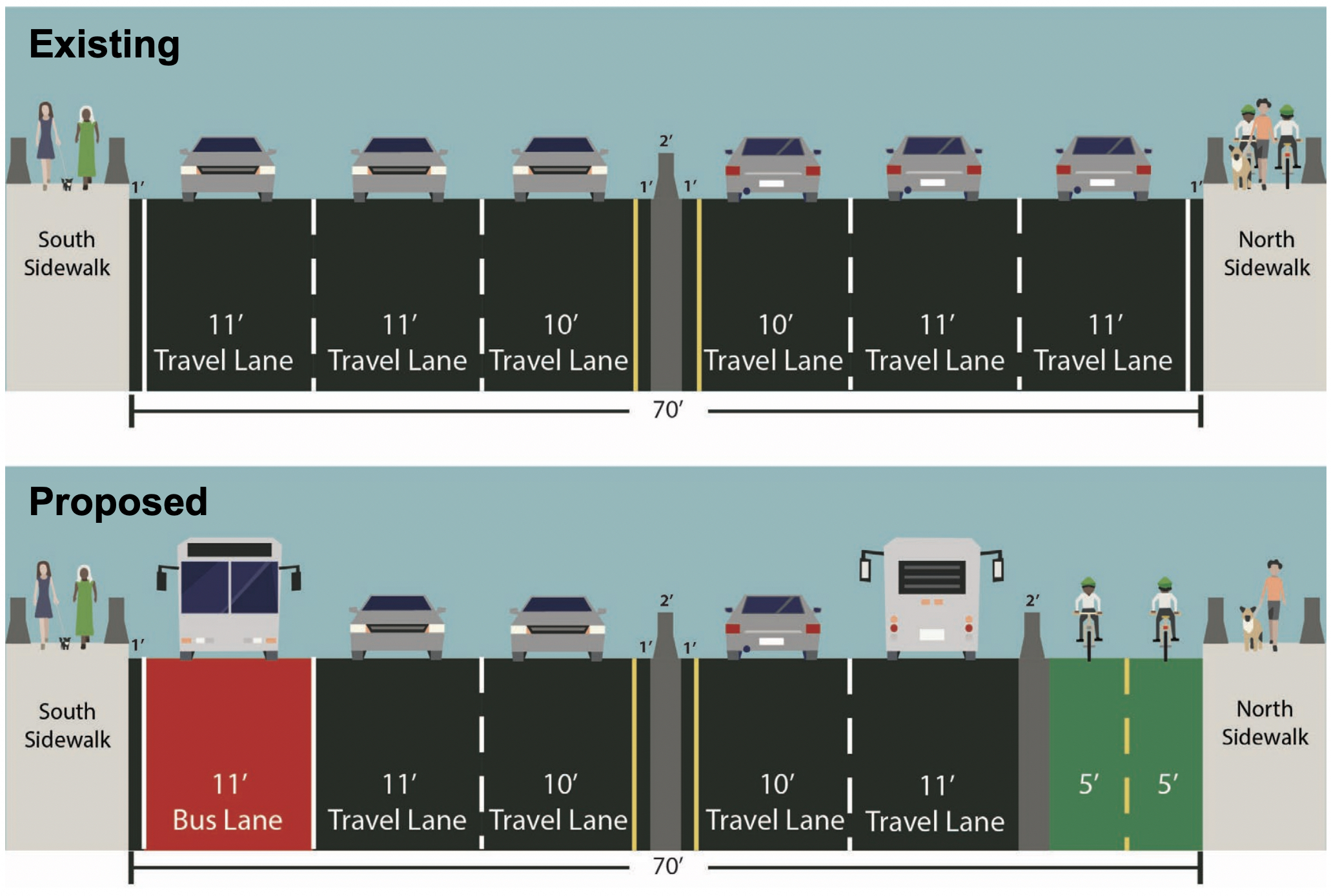The two lanes would link to bike and bus infrastructure on either side, benefitting thousands of cyclists and bus riders while also giving back more space to pedestrians on the narrow outer pathways.