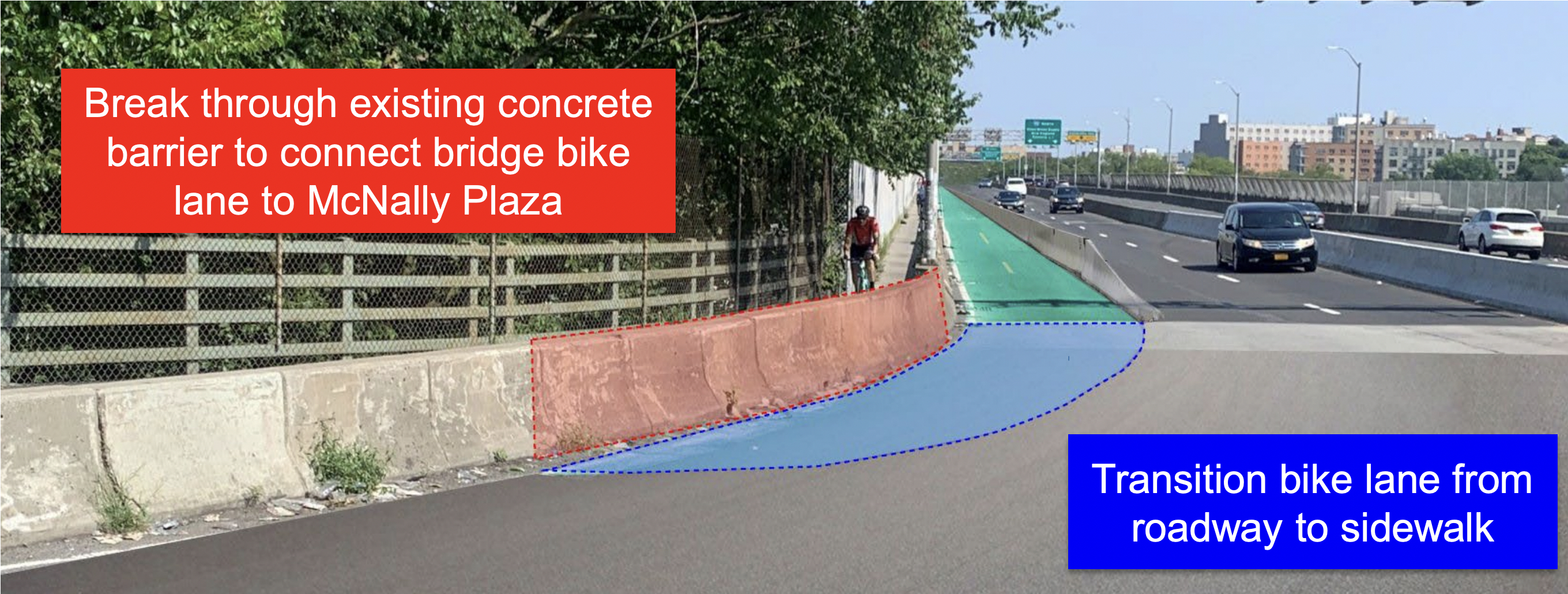 The bike lane would reconnect to the wider footpath on the Manhattan side and continue on through McNally Plaza and to a proposed protected path through Laurel Hill Terrace to Amsterdam Avenue. To make space for that, DOT will remove 20 parking spaces on Laurel Hill Terrace.