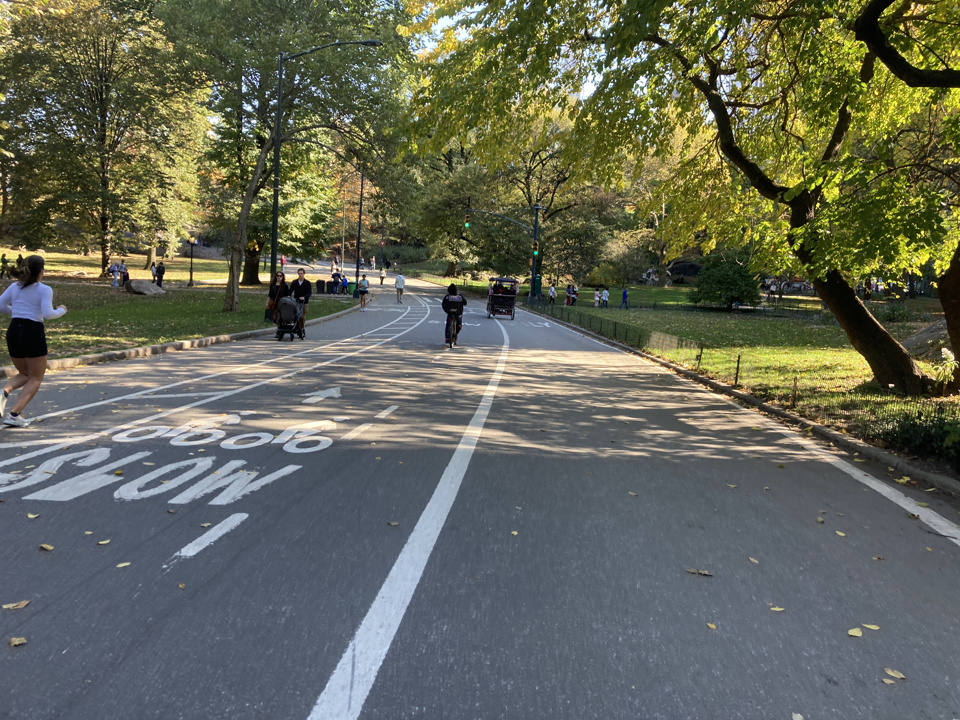 Now, there are three lanes inside the park that make up the loop, marked only by fading white paint. In a counterclockwise direction, the inner-most lane is typically reserved for people on foot, including walkers and joggers and those in wheelchairs; the middle lane is used by bikes and other mobility-type devices, and it’s divided by slower-moving people on the left with those going faster on the right, meaning you – counterintuitively —pass on the right; and the outer-most lane is for vehicles, though not private.
