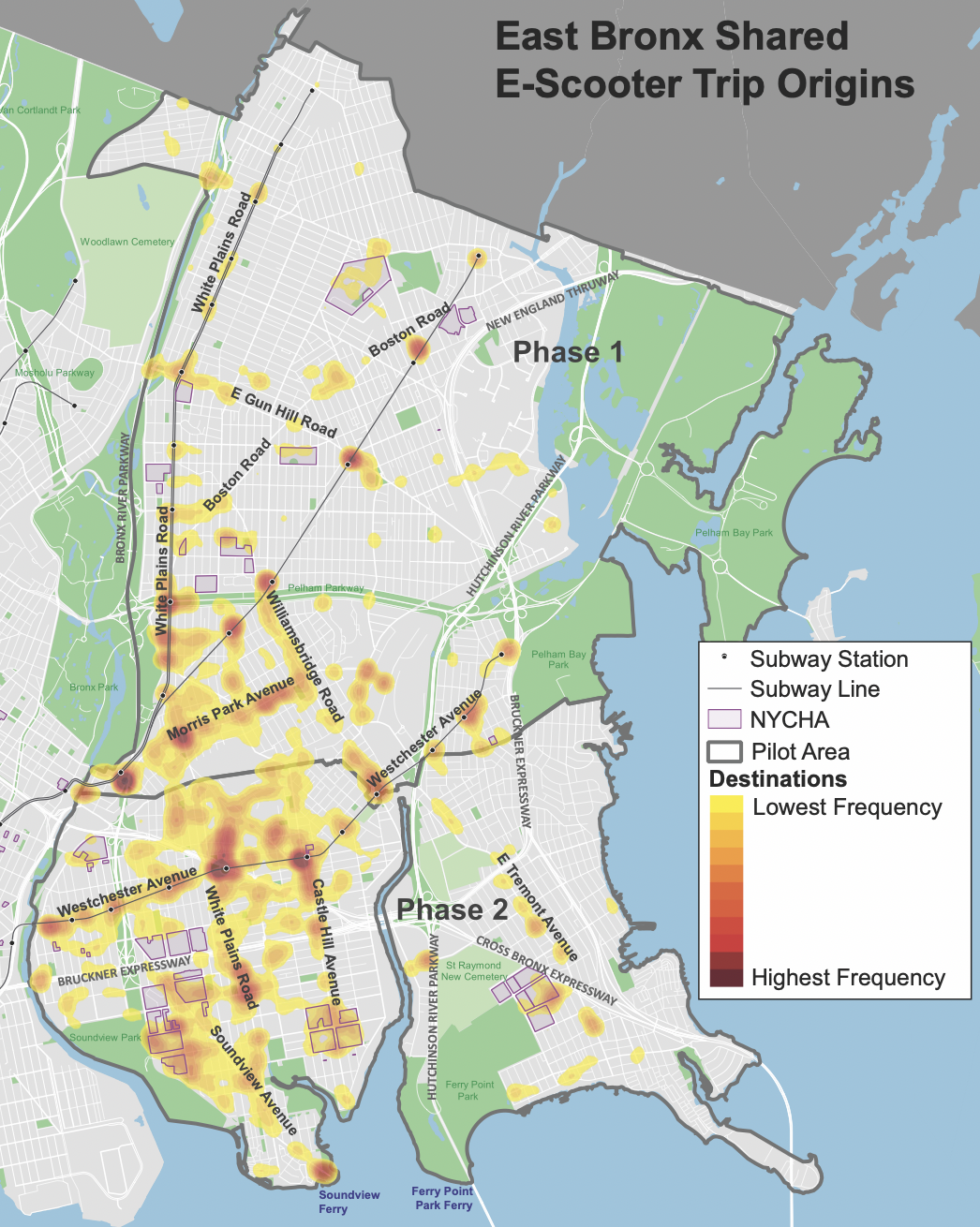 Morris Park Avenue, a commercial corridor in the Morris Park neighborhood, had the highest number of e-scooter trips. The corridor has a conventional bicycle lane in both directions as well as access to the 2 and 5 subway lines and two buses. The eastern end of Morris Park Ave is home to Yeshiva University, Albert Einstein College of Medicine, the Montefiore Medical Center, and the Jacobi Medical Center. Other corridors with high trip volumes included White Plains Road, Boston Road, East Gun Hill Road, and Williamsbridge Road. Of these three roads, only a portion of White Plains Road has a bike facility, highlighting potential demand for additional infrastructure improvements on major corridors. The first month of service in Phase 2 showed that Castle Hill Ave, White Plains Road, Westchester Avenue, and East Tremont Avenue are popular routes in the southern section of the service area.