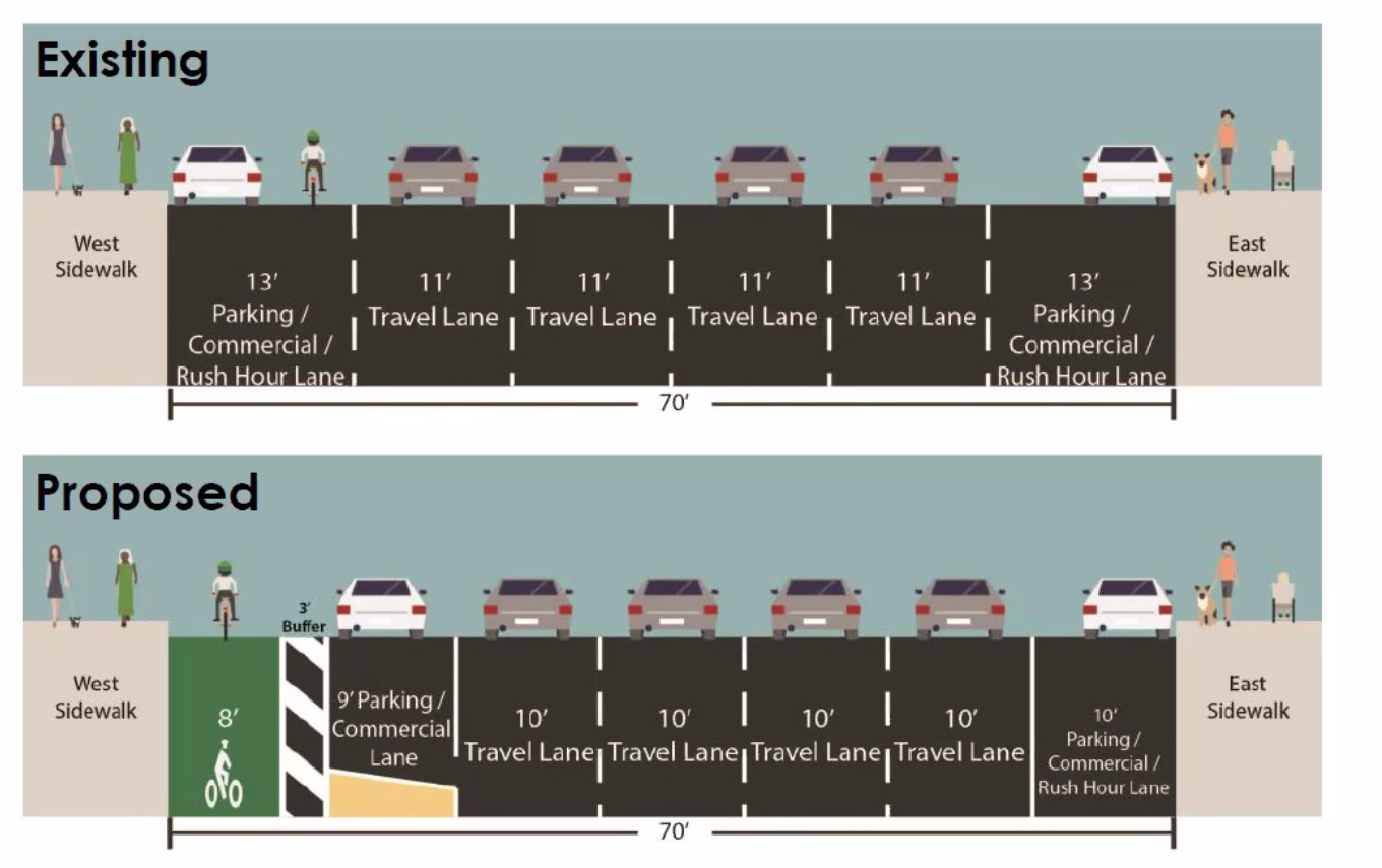 But for 19 blocks in the middle of the project area — between W. 23rd and W. 42nd streets — the roadway gets 10 feet wider and officials will add in the bicycle path while tightening the four existing car lanes without removing any of them.