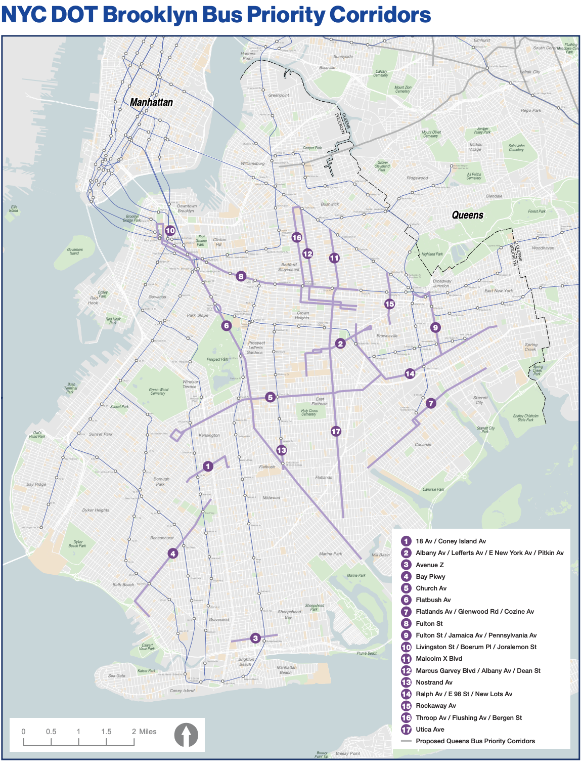 It’s too early to say exactly how the priority corridors will be redesigned — the toolbox includes dedicated bus lanes, car-free busways or merely transit signal priority — but the corridors in question need help: MTA officials said they were chosen because they are areas that need increased bus service, have high ridership and poor performance numbers, and play a crucial role in Brooklyn transit ecosystem.