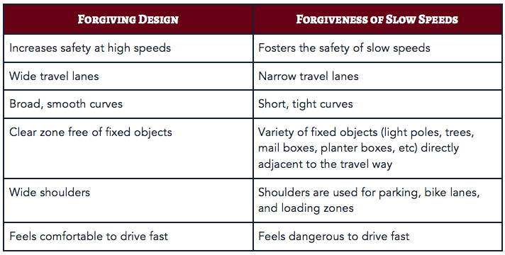 Most U.S. roadways send drivers mixed messages in how the law asks drivers to perform versus what the design of the road communicates is safe. The common design seen on U.S. roadways is based on the concept of “forgiving design,” where engineers create wide roads with high visibility in all directions in the expectation that drivers make occasional mistakes. This extra space is supposed to make driving safe, but it counteracts itself by also signaling to drivers it’s safe to drive at high speeds, which makes urban roadways unsafe.