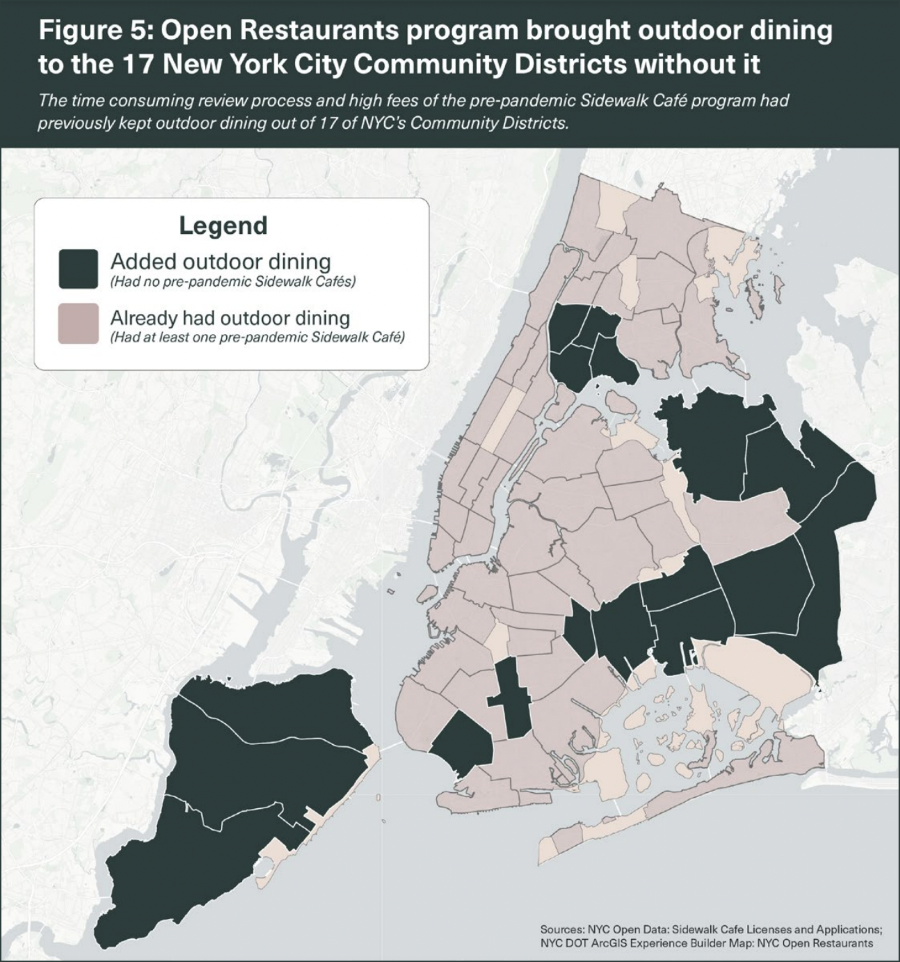 “The time-consuming review process and high fees of the pre-pandemic sidewalk café program had previously kept outdoor dining out of 17 of New York City’s community districts,” the NYU report said.