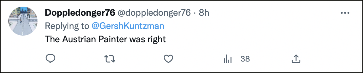The tweet above was mild. Other threats that can be printed in a family website included, “Show us on the doll where the rabbi touched you,” “the Austrian painter was right” and “You should get a Glasgow smile.”