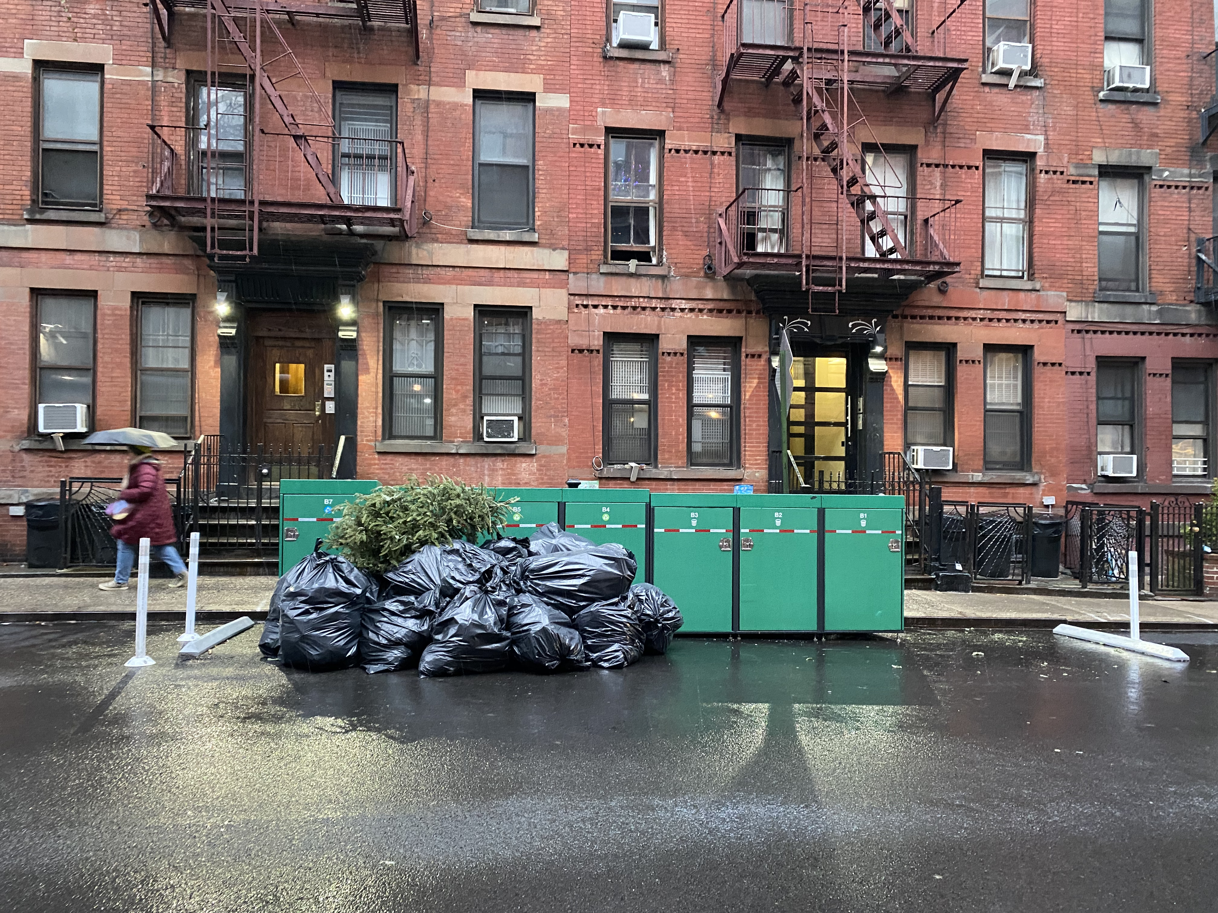 That's still preferable to what happens on every other block — heaps of garbage bags that pedestrians have to navigate around — said Christine Berthet, whose pedestrian safety advocacy group CHEKPEDS organized to get all the buildings on board with the program.