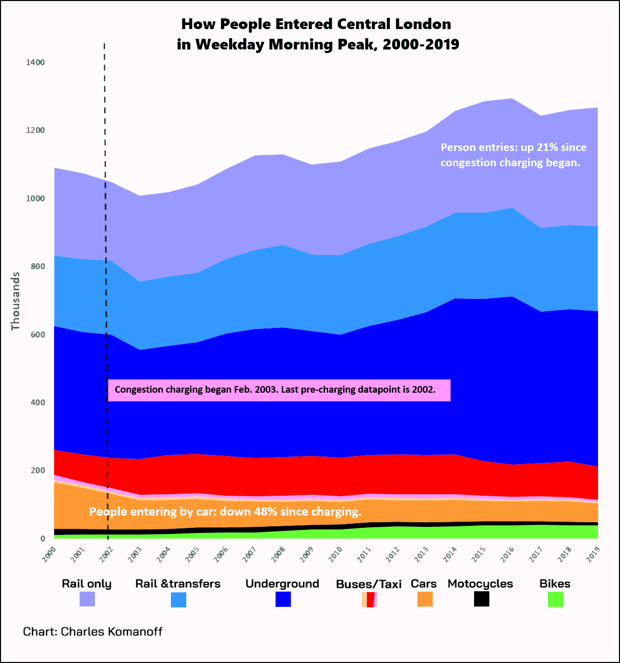 - On average, 1.27 million people entered London’s charging area during the morning peak (7-10 a.m.) in 2019. That was down a percent or two from 1.29 million in 2015, but it is still 21 percent (or 220,000 people) more than the 1.05 million who traveled into Central London in the same peak hours in 2002, the last year before congestion pricing.