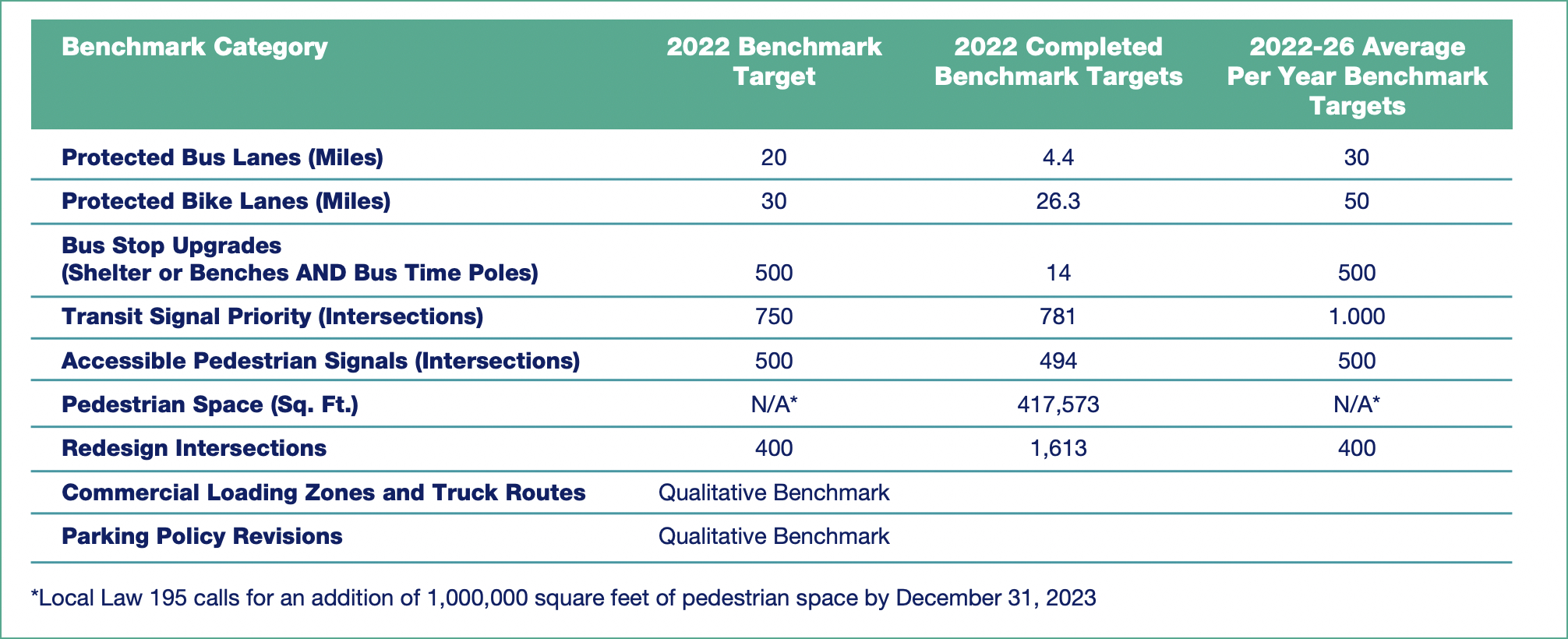 Under the 2019 Streets Plan law DOT has to build out 150 miles of bus lanes over five years that are protected by physical barriers or stationary or mobile ticketing cameras, with at least 20 miles required in its first year of 2022.