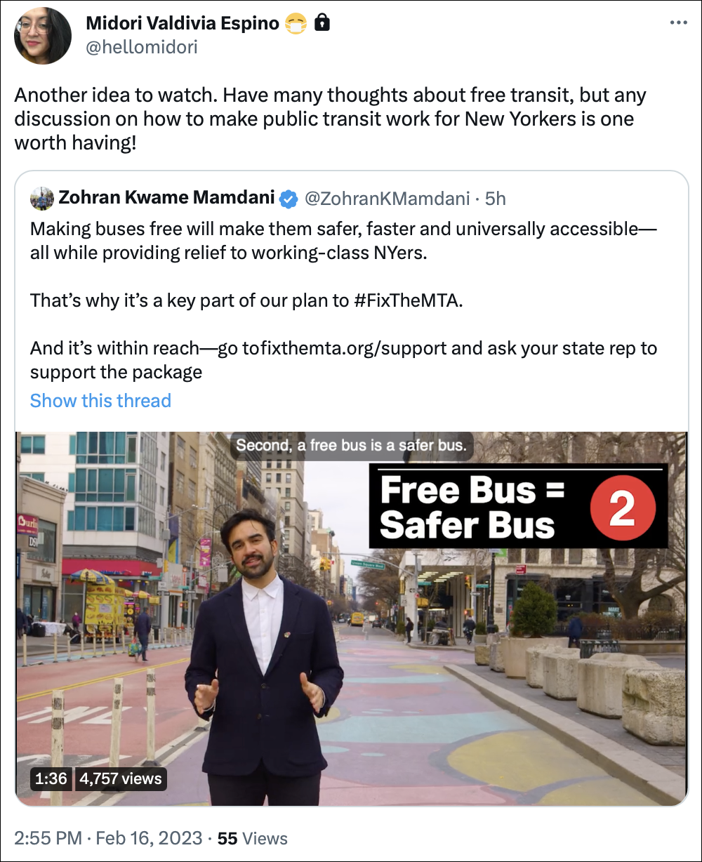 - One of Eric Adams’s MTA Board members (whose tweets are locked) said some nice things (see tweet, right) about free buses (presumably because the state would pay?).