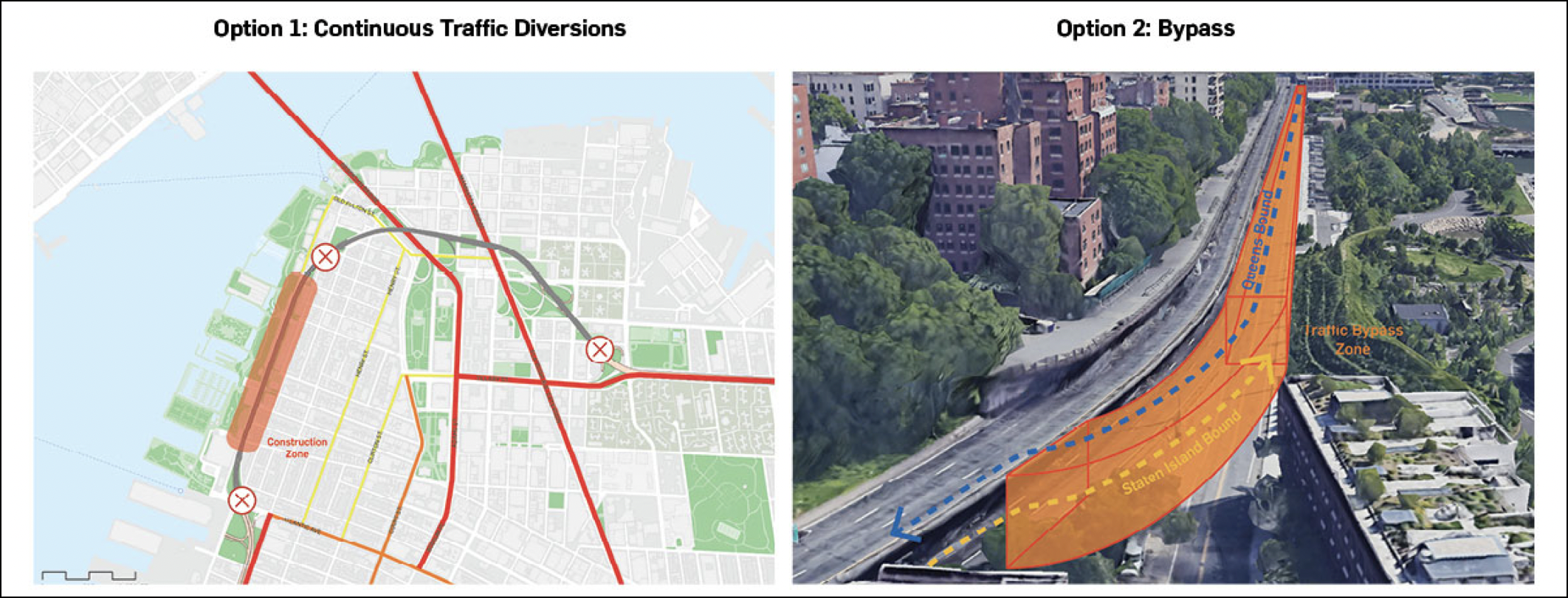 According to DOT officials, the city has two options throughout construction of the crumbling infrastructure: a diversion, which would close the BQE on some nights and weekends and send traffic onto local roads, or a bypass road to function as a temporary highway adjacent to the existing BQE.