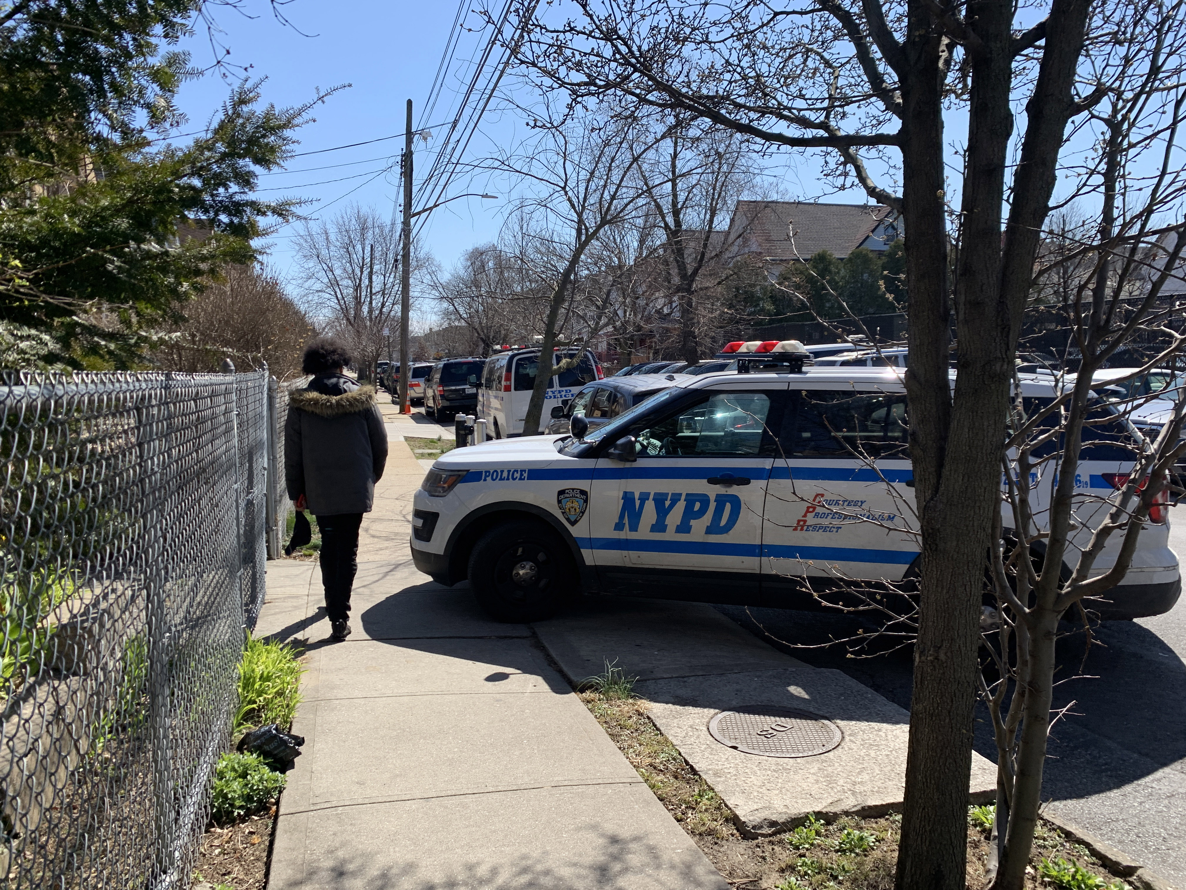 Cops under the leadership of Captain Jerome Bacchi have essentially erased the pedestrian right of way on 101st Street with their angle-parked cars, leaving no room for pedestrians. Kids and families who use the park — and employees of the precinct themselves — must walk in the roadway to get anywhere. Streetsblog observed multiple people forced to do that dance on Thursday, including cops from the precinct walking home to the train.
