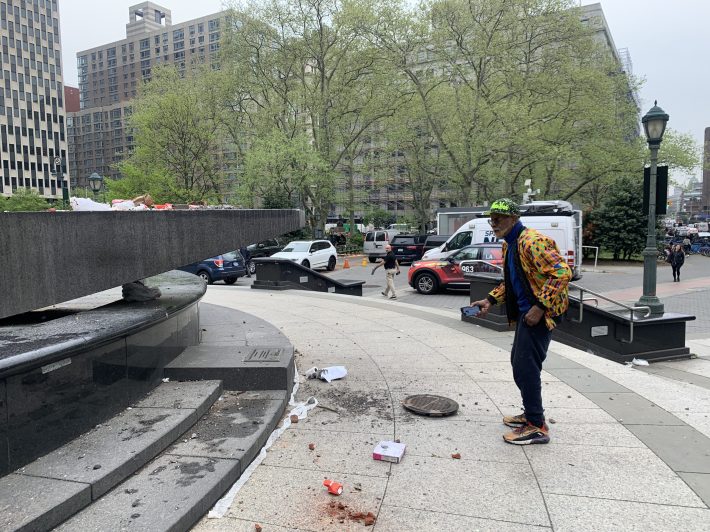 Slavery was legal in New York City until 1827, but the way this plaza is treated is a reminder that forgetting about the city’s history with human bondage remains a semi-official policy: The plaza itself is all cracked due to the weight of heavy cars driving on it whenever there’s an important case in the federal or state courts nearby. The fountain is covered over. There’s garbage everywhere.