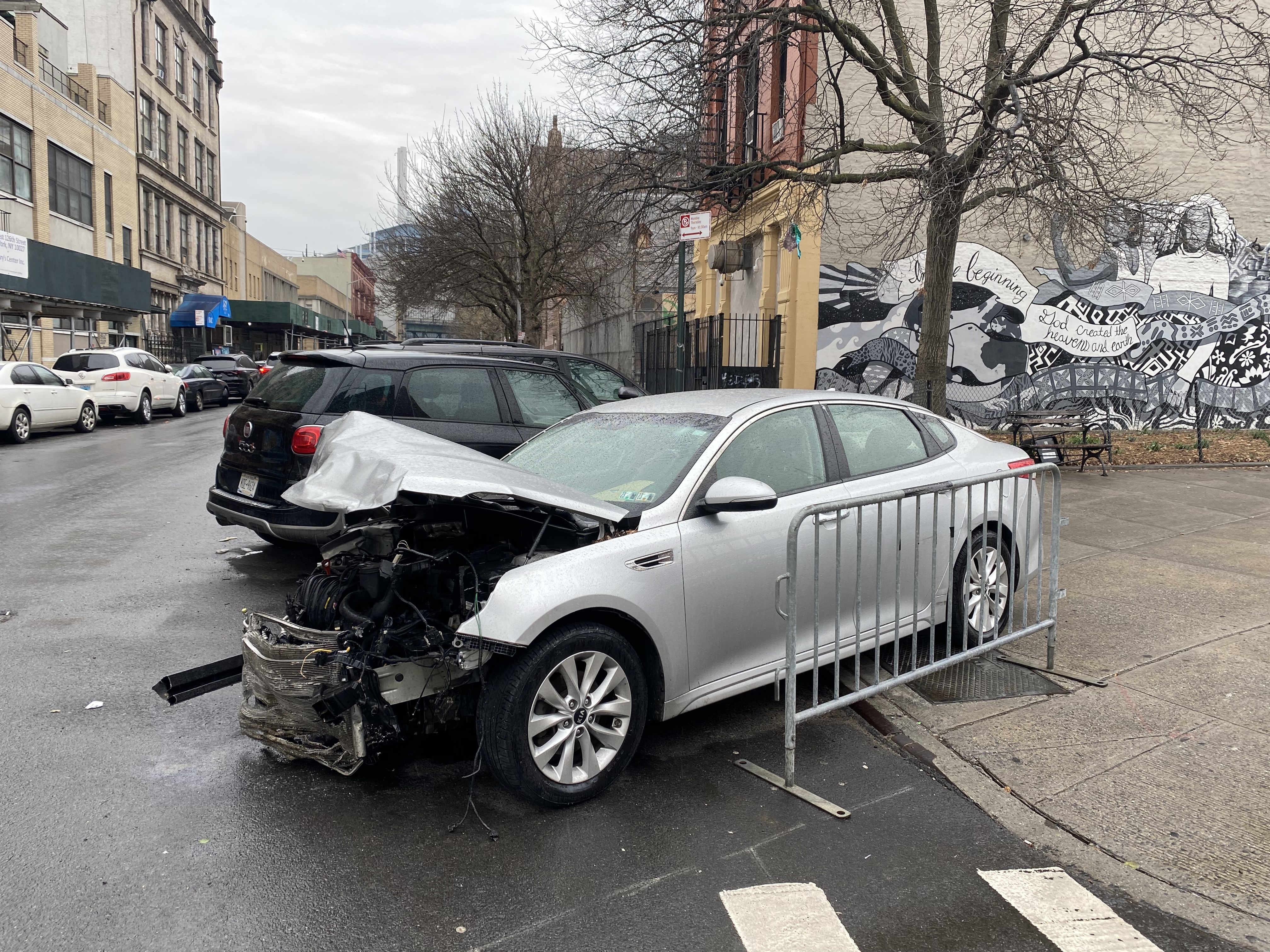 At the corner of Amsterdam Avenue, a mangled car greets residents: