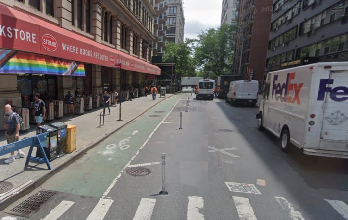- There are protected bike lanes on plenty of narrow, cross-town streets, so we don’t know what the hell the West Side Rag is talking about when it suggests that bike lanes are not mathematically possible. (See photo, above right)