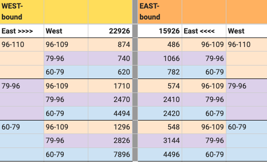 In each direction, the biggest share of riders, 7,896, took out a bike on the east side of the park between 60th and 79th streets and docked it within the same boundaries on the west side. And heading eastbound, the highest number of riders, 4,496, similarly crossed the park between 60th and 79th streets.
