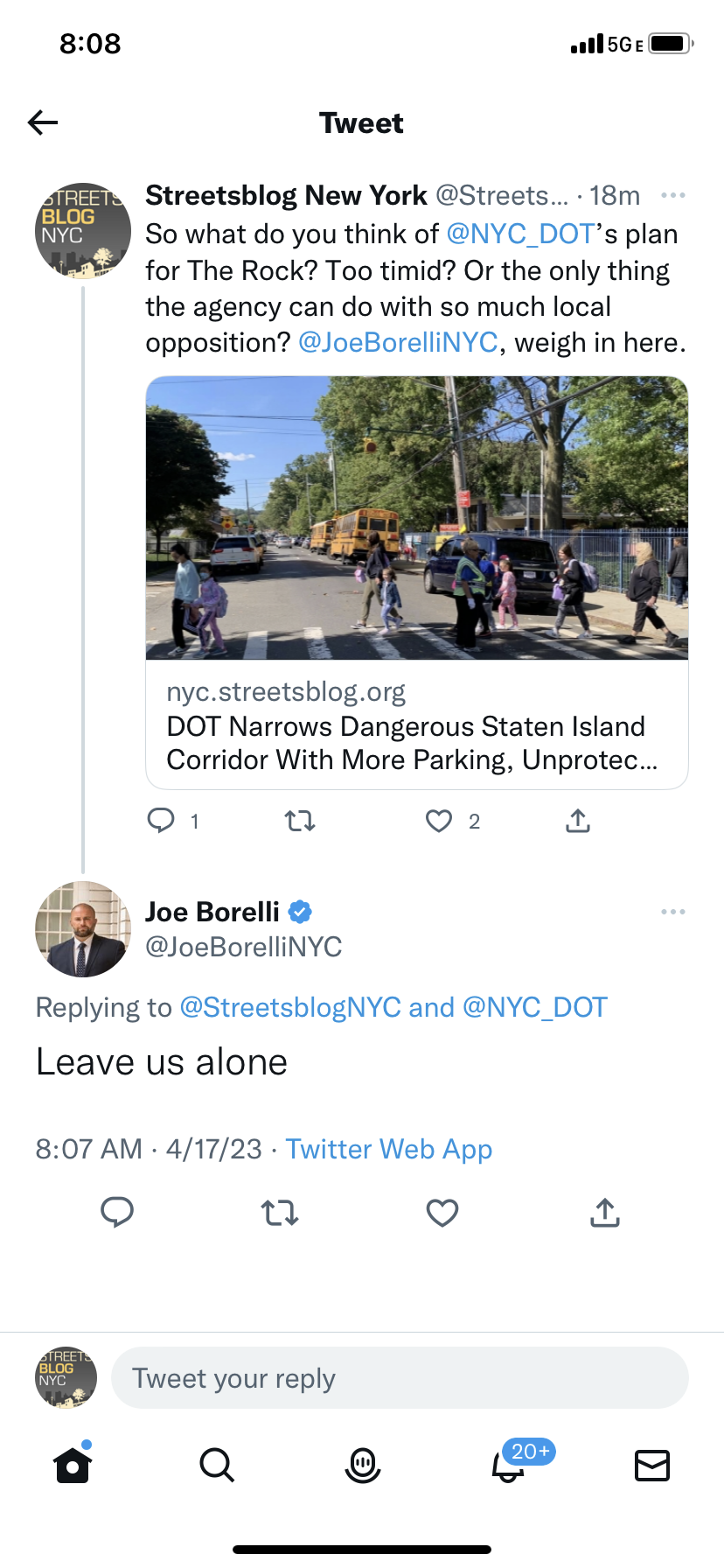 - Finally, we tweeted on Monday about a fairly tepid street redesign for Staten Island and asked Council Member Joe Borelli what he thought of the fairly basic painted bike lane and road diet. His answer was more than telling about the Republican minority leader’s feelings about safer streets for his constituents: